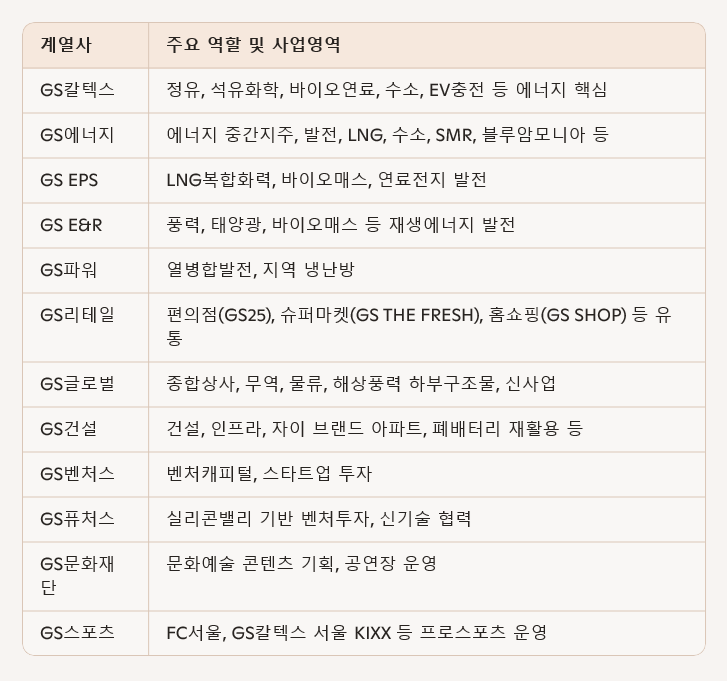 2025년 5월 기준 GS그룹은 국내 98개 계열사를 보유하고 있다. 주요 계열사와 그 역할은 다음과 같다.