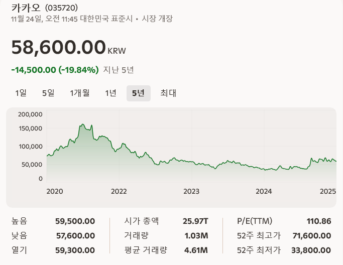카카오는 코스피 상장사(종목코드 035720)로, 최근 주가는 약 58,600원 수준입니다. 콘텐츠·금융·AI·모빌리티 등 다각화된 사업 구조 덕분에 경기 변동에도 비교적 안정적인 흐름을 보이며, 중장기적으로 성장 잠재력이 높은 기업으로 평가됩니다.