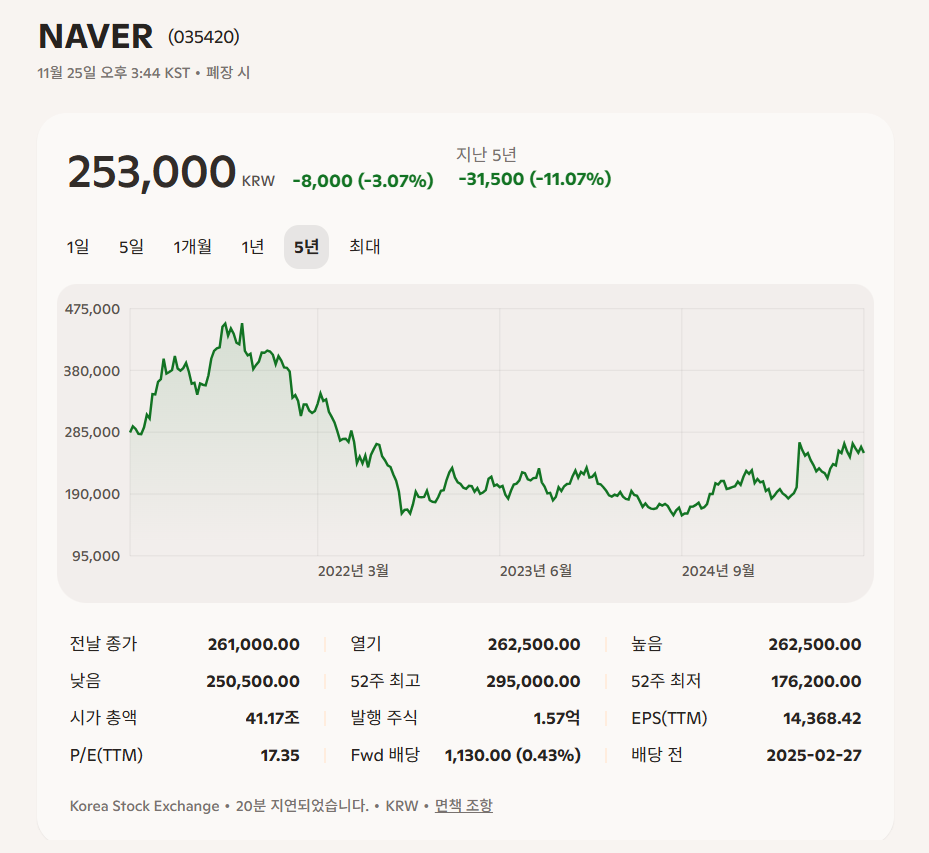 현재 네이버 주가는 253,000원으로, 최근 1년간 약 28.7% 상승했습니다. PER은 20.86, PBR은 1.45로 업종 평균 대비 안정적인 수준을 보이고 있습니다.