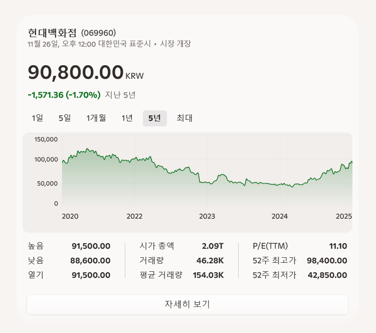 현대백화점 주가는 최근 90,900원 수준으로 거래되고 있으며, 면세점 회복과 지누스 실적 개선이 긍정적 요인으로 작용하고 있습니다. 투자자는 백화점 사업의 안정성과 신사업의 성장성을 균형 있게 고려해야 하며, 단기적으로는 경기 변동성에 따른 조정 가능성을 감안해야 합니다. 장기적으로는 비전 2030 전략, 글로벌 진출, ESG 경영이 기업가치 상승을 견인할 것으로 전망됩니다.