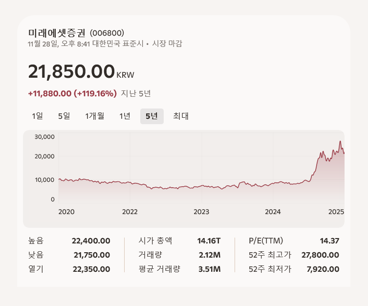 미래에셋은 1997년 박현주 회장이 설립한 이후, 투자전문 금융그룹으로 성장해왔다. 현재 국내외 19개 지역에 진출해 있으며, 임직원 수는 약 15,500명, 고객자산은 1,060조 원에 달한다. 미래에셋증권은 국내 최대 증권사로, 위탁매매·투자은행(IB)·자산관리(WM)·ETF·글로벌 투자 등 전방위 금융 서비스를 제공한다.