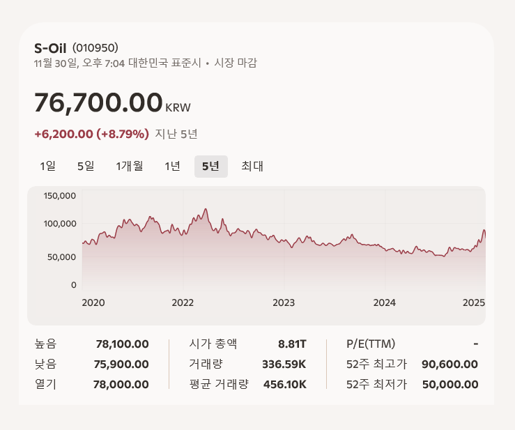 현재 주가는 8만 원대에서 움직이고 있으며, 12개월 기준 상승률은 60%를 넘는다. 이는 투자자들이 S-Oil의 미래 성장성을 긍정적으로 평가하고 있음을 보여준다. 정유주는 경기 민감 업종이지만, S-Oil은 수직 계열화와 고도화 설비를 통해 마진 방어력이 뛰어난 기업으로 자리매김하고 있다.