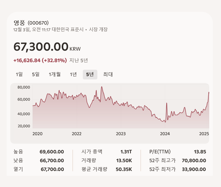 2024년 하반기 고려아연의 공개매수 결정은 영풍 주가를 단기 급등시킨 바 있으며, 이후에도 관련 기대감이 반등 요인으로 작용했습니다. - 코스피 지수 반등 효과 최근 국내 증시가 전반적으로 상승세를 보이면서, 영풍 역시 시장 분위기에 따라 주가가 동반 상승했습니다