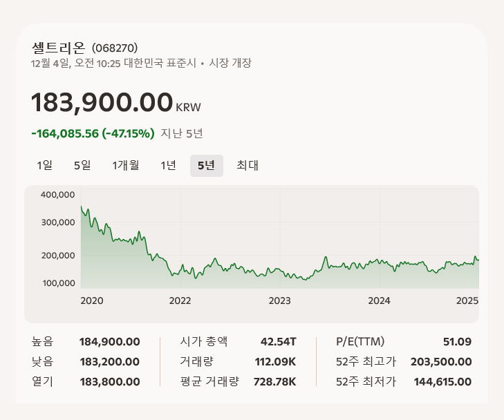 셀트리온의 현재 주가는 약 183,900원으로, 시가총액은 약 42조 원 규모입니다. 최근 1년간 주가는 13% 이상 상승하며 안정적인 성장세를 보이고 있습니다. 외국인 지분율은 약 21%로 글로벌 투자자들의 관심도 높습니다.